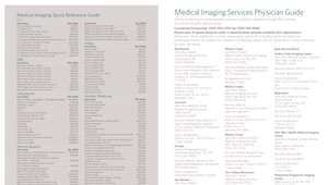 Medical imaging quick reference guide and imaging services physician guide with all contact information, Epic IMG#, and CPT codes listed.